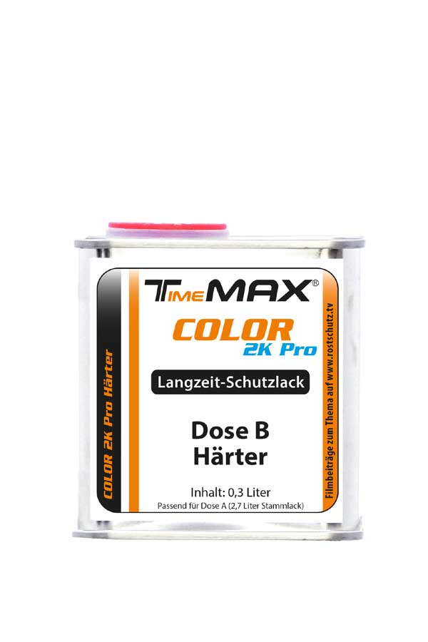 Jetzt zu dem Produkt, das Sie gerade in der Hand halten: TimeMAX COLOR 2K Pro. Wir haben es u. a. wegen der oft gewünschten Kombi-Behandlung von COLOR und schneller trocknenden 2K Extrabeschichtungen (wie z. B. TimeMAX BODY) eingeführt. Wie auch unser Steinschlagschutz BODY, wird COLOR 2K Pro mit zusätzlichen Härter als Set geliefert. Weitere Vorteile neben der sehr schnellen Trocknung: Auf schwierigen Untergründen, wie Hartkunststoff , Dichtmasse, Aluminium und Zink (recherchieren: „Zinkwäsche“!) haftet COLOR 2K Pro nochmals besser.